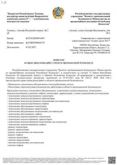 В соответствии с Законом Республики Казахстан «О гражданской защите» и Законом Республики Казахстан «О разрешениях и уведомлениях», компании «Атлант групп 2017» предоставлено право выполнения работ в сфере обеспечения промышленной безопасности на территории Казахстана, а именно: